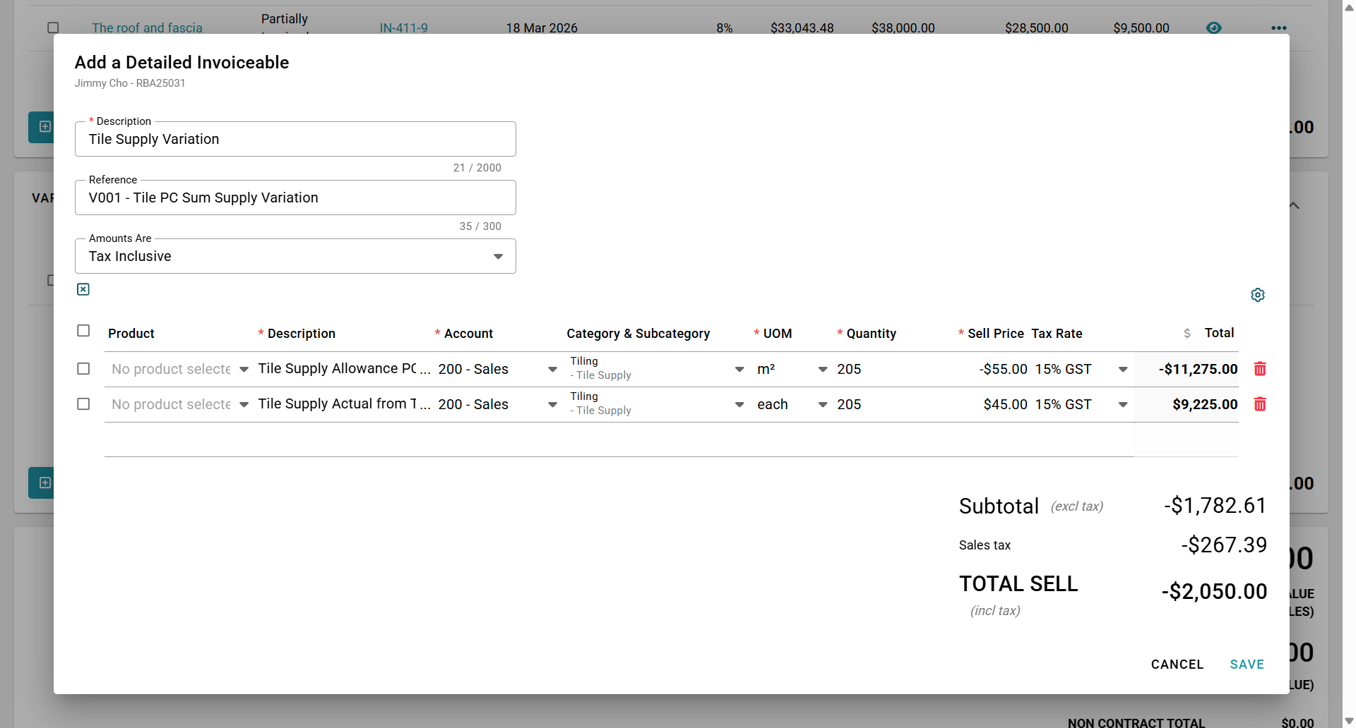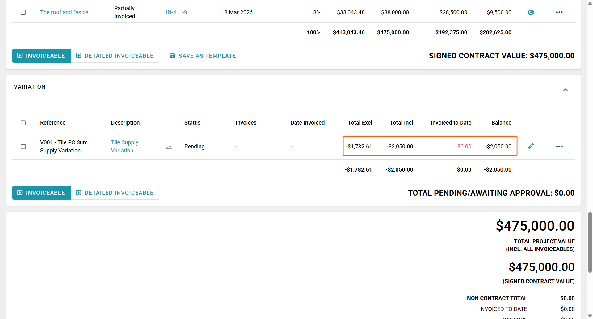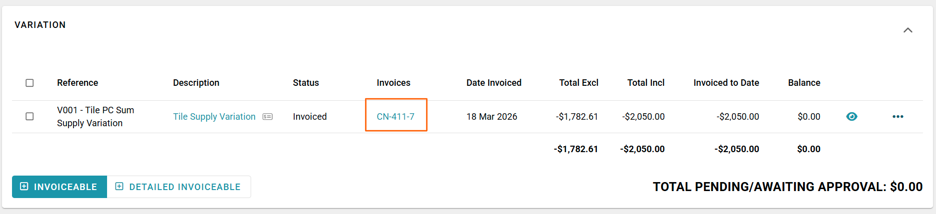Previously negative pending and accepted variations would be highlighted in red (e.g. -$2050) on the Progress Payment sub-tab. However, now that we have changed to invoiceables and invoices this is no longer the case. It will now display in black (e.g. $2050.00)
