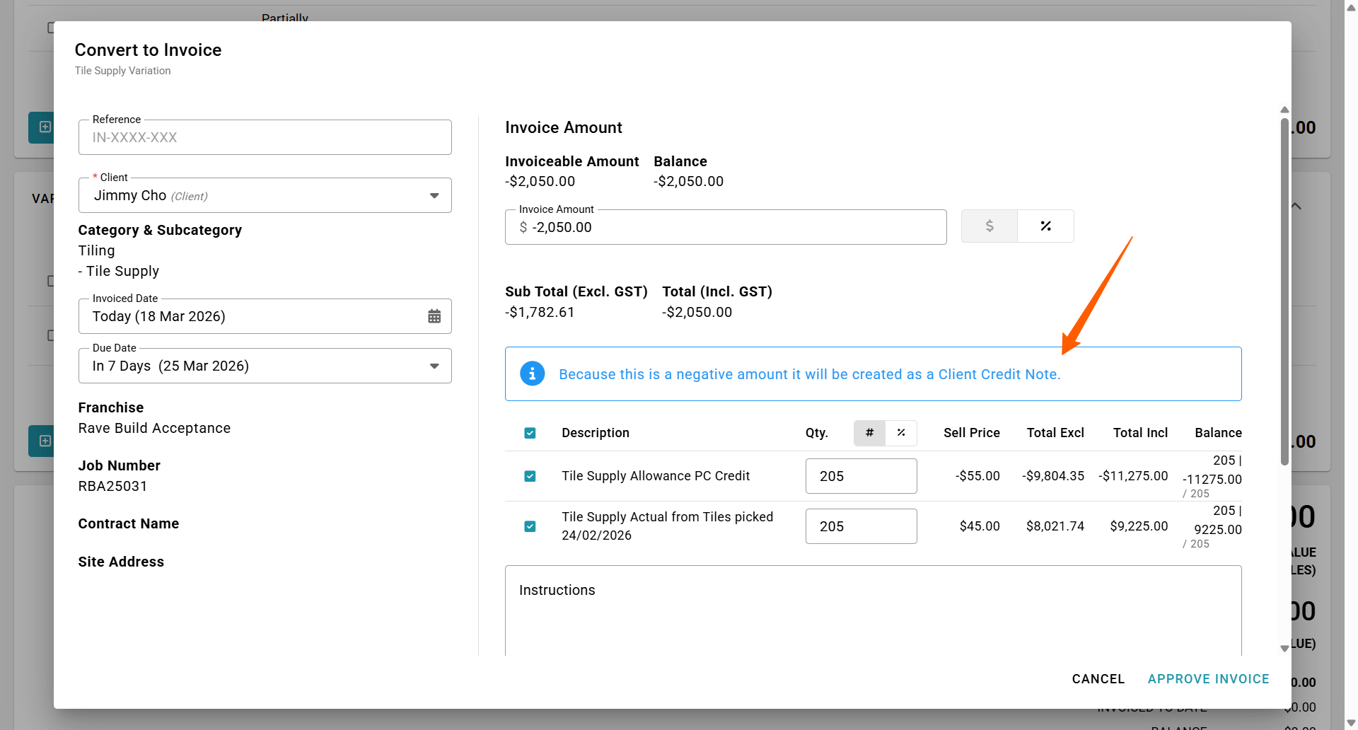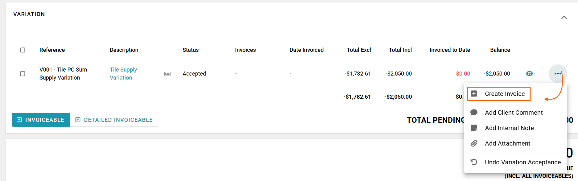 When you convert a negative variation invoiceable to a credit note, the dropdown menu option will still display as 'Create Invoice'. But the convert to invoice pop-up display will include a note 'Because this is a negative amount it will be created as a Client Credit Note.'. This is because RAVE does not identify this as a positive (charge amount) or a negative (credit amount) until the pop-up appears.