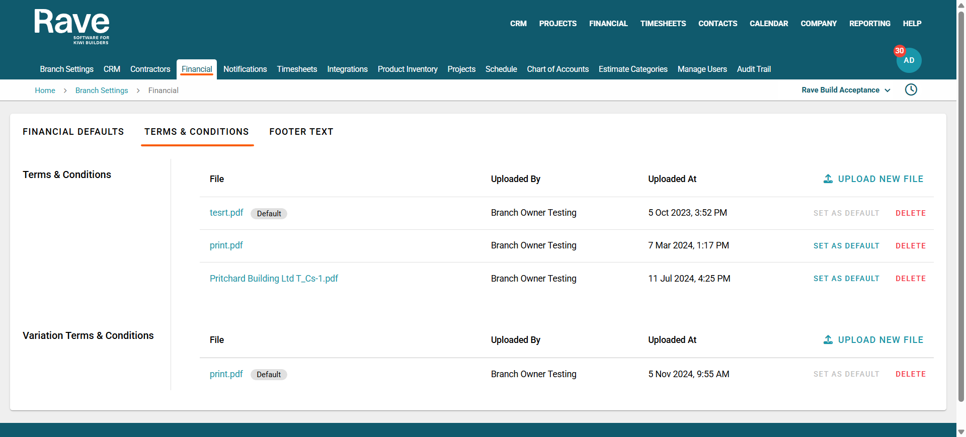 The Terms and Conditions sub-tab is where you can upload your Estimate and Variation Terms and Conditions, which can be attached to Client Proposals.