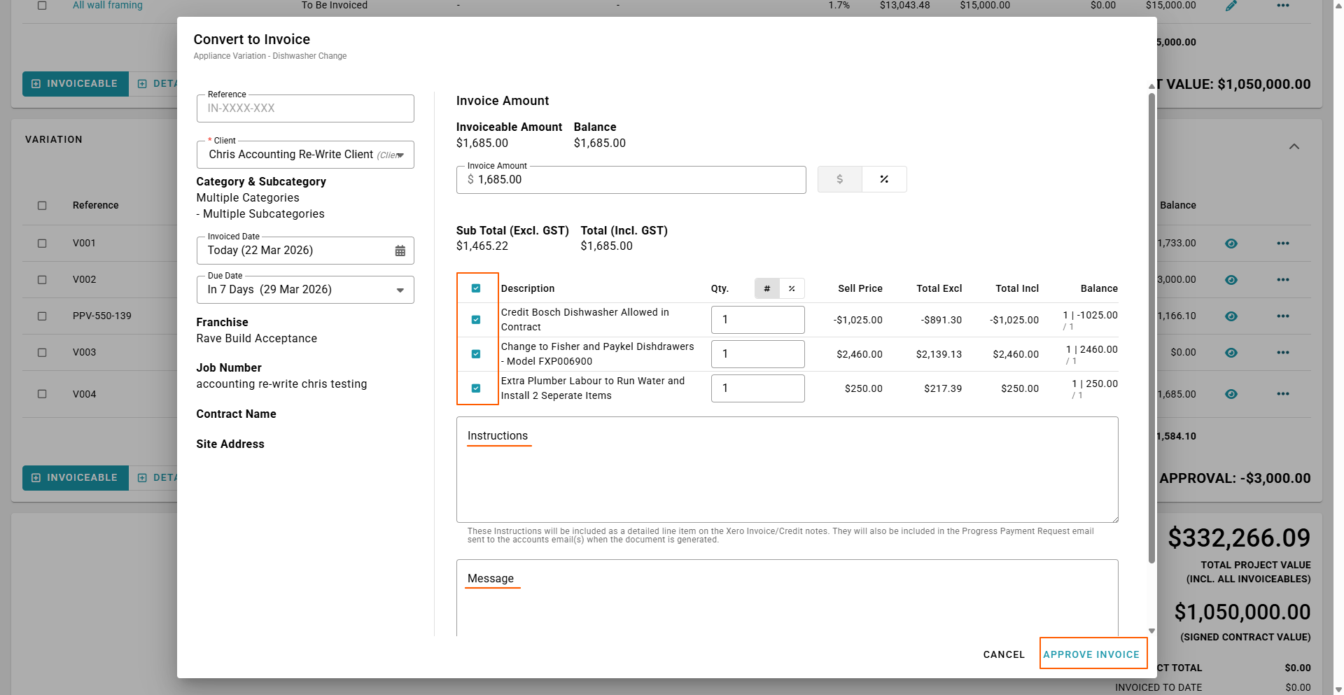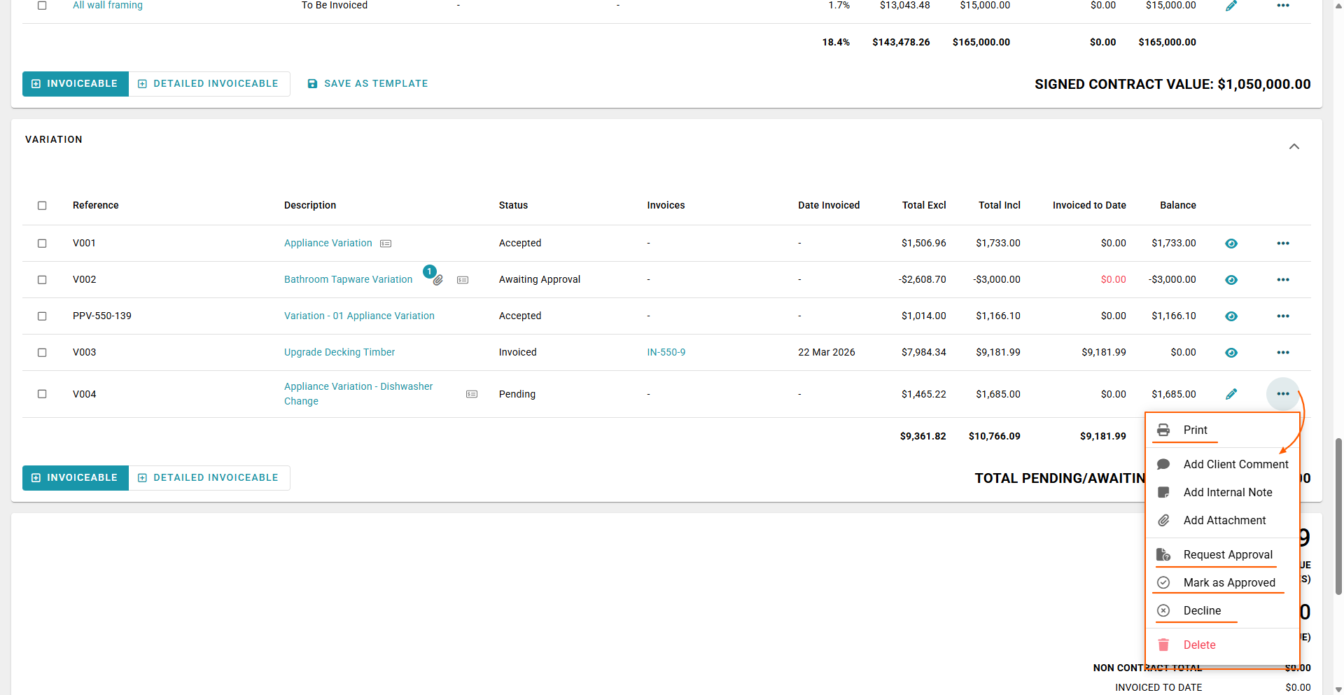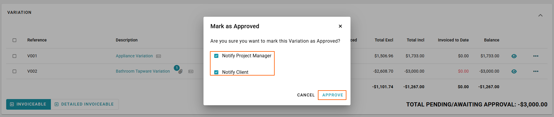 RAVE provides three simple ways to manage the approval of pending variations via the Progress Payments sub-tab.