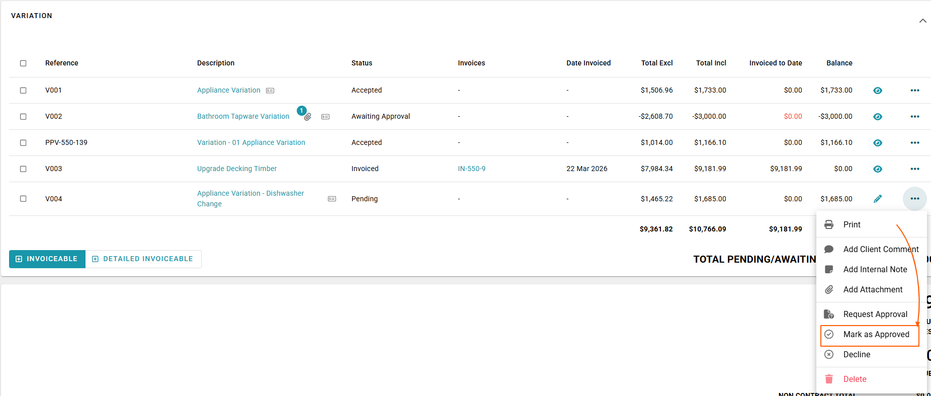 - Click the ellipsis next to the Pending Variation