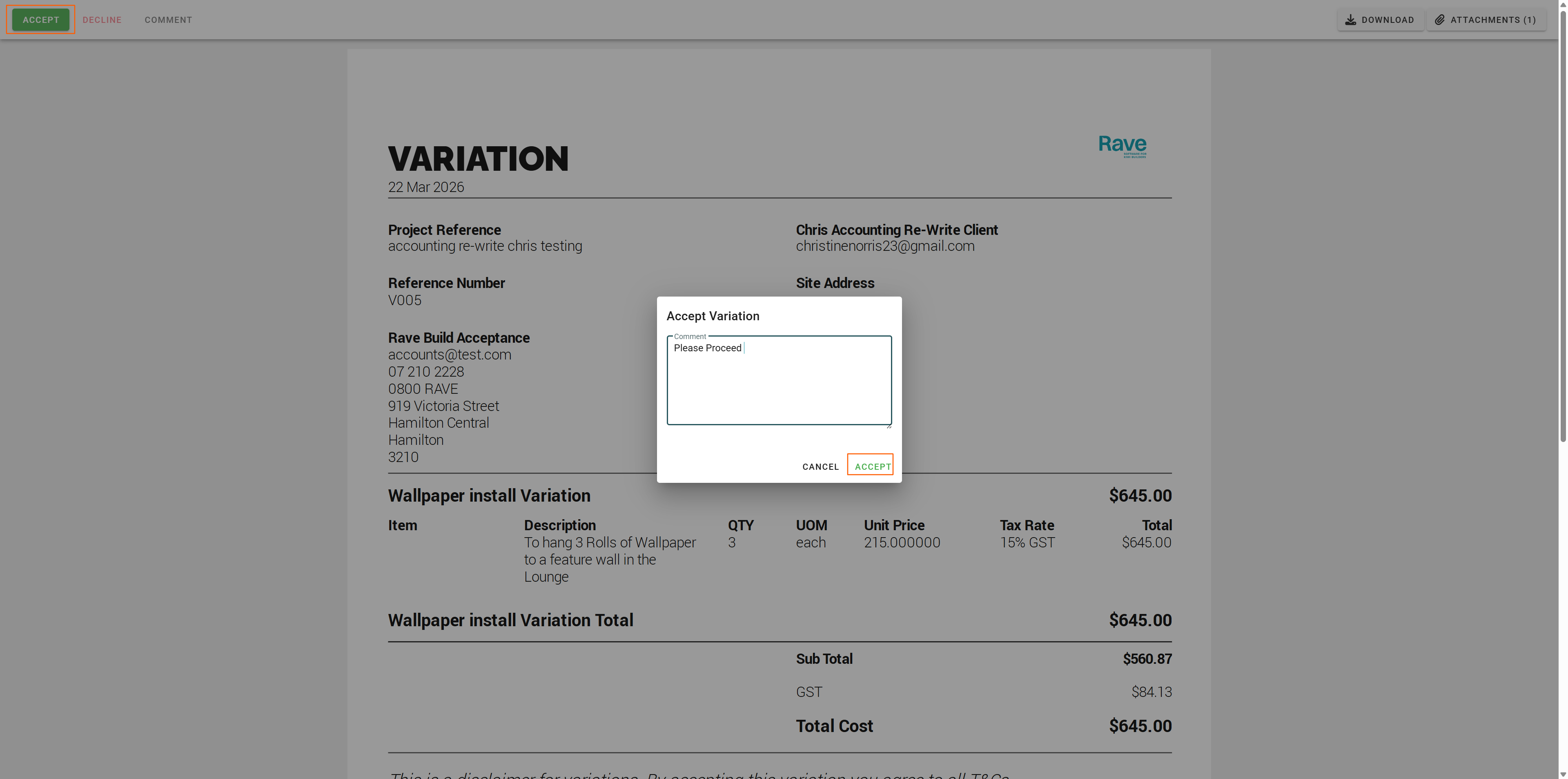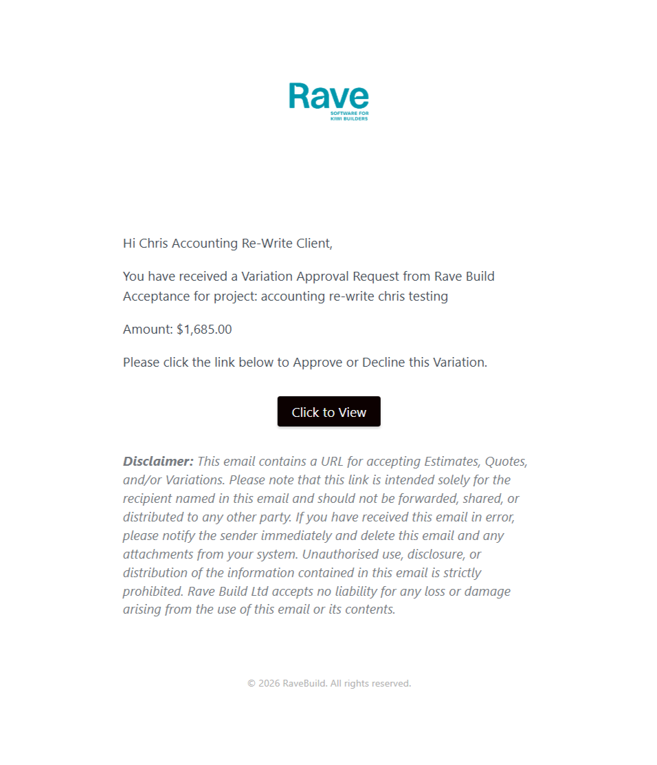 The Variation Status and Comments are Updated in RAVE - when it is Approved by the Customer
