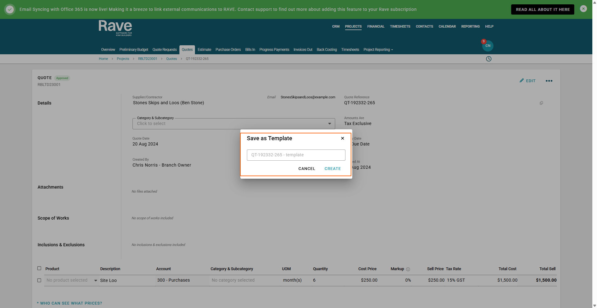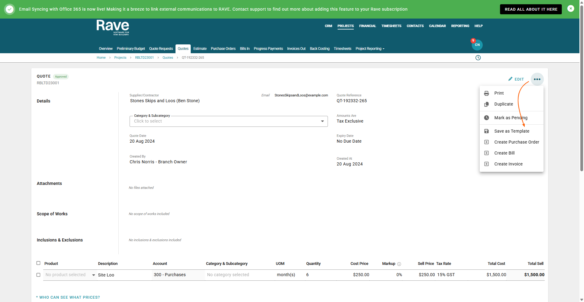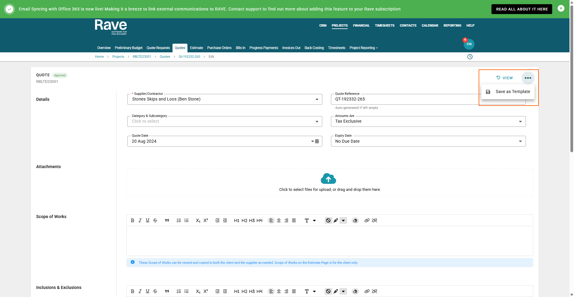 once you have created your quote you can template it for use again and again. While in an approved or pending mode you can click on the three dots and Save As Template (note: no due date must be selected as the quote expiry date to save as a template)