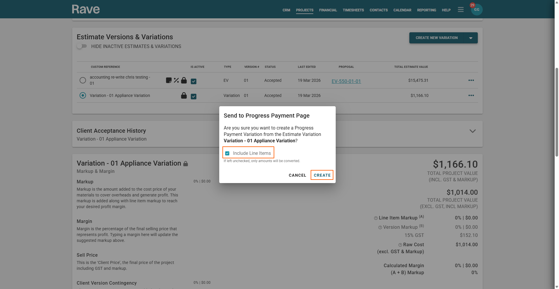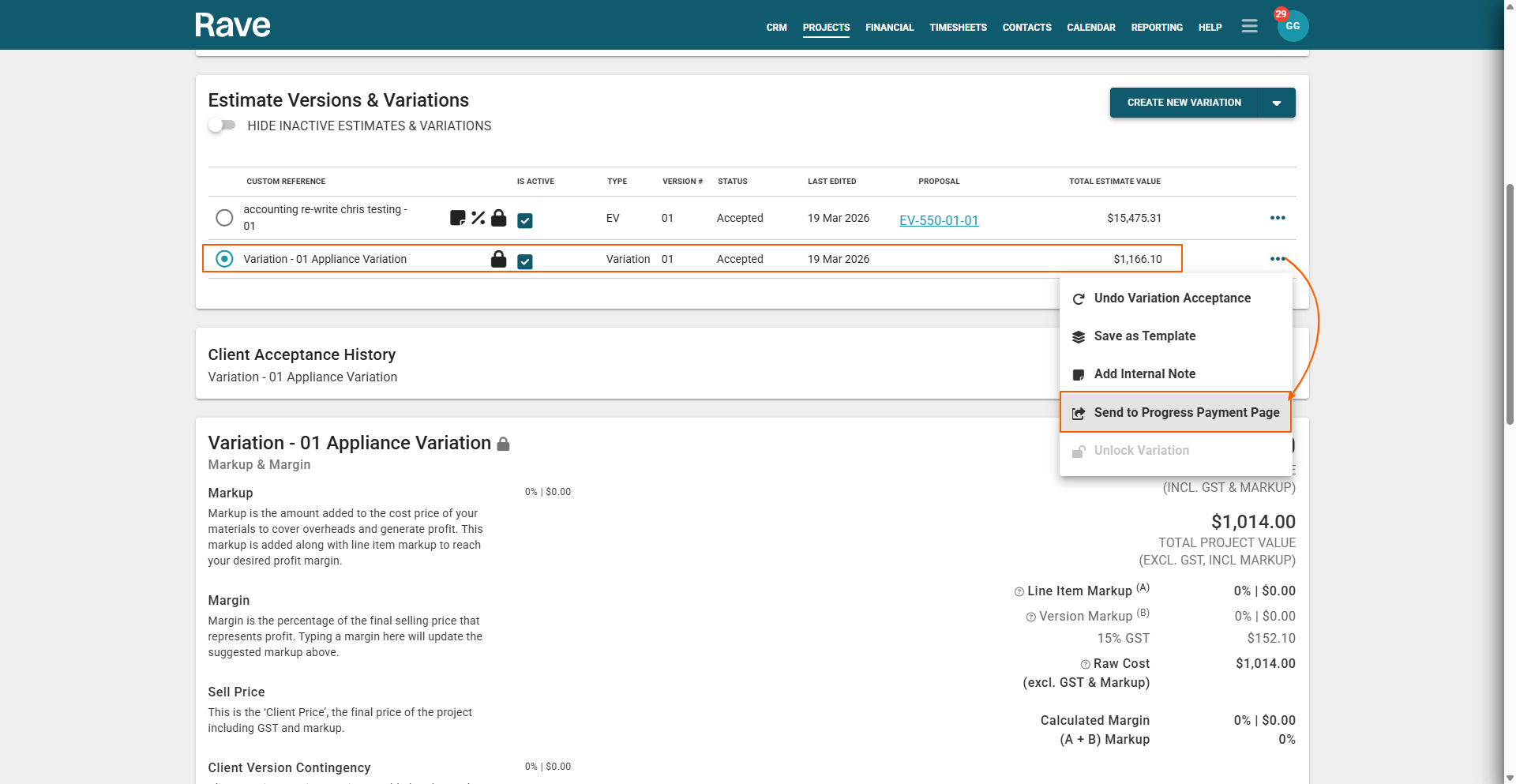 If you have been using RAVE's Financial Management System to create Client Variations, you will LOVE our feature to automatically turn your accepted client variations into invoiceable on the Progress Payment sub-tab.