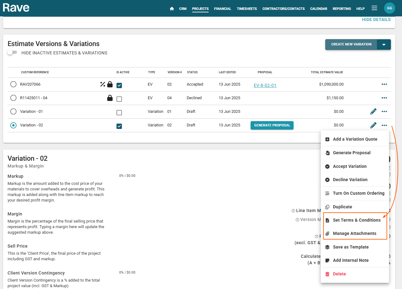 3. Next, you can add Variation Quotes by scrolling down to the Variation section or clicking on the 3-dot action drop-down on the right-hand side of the variation in the 'Estimate Versions and Variation' section and selecting Add a Variation Quote.