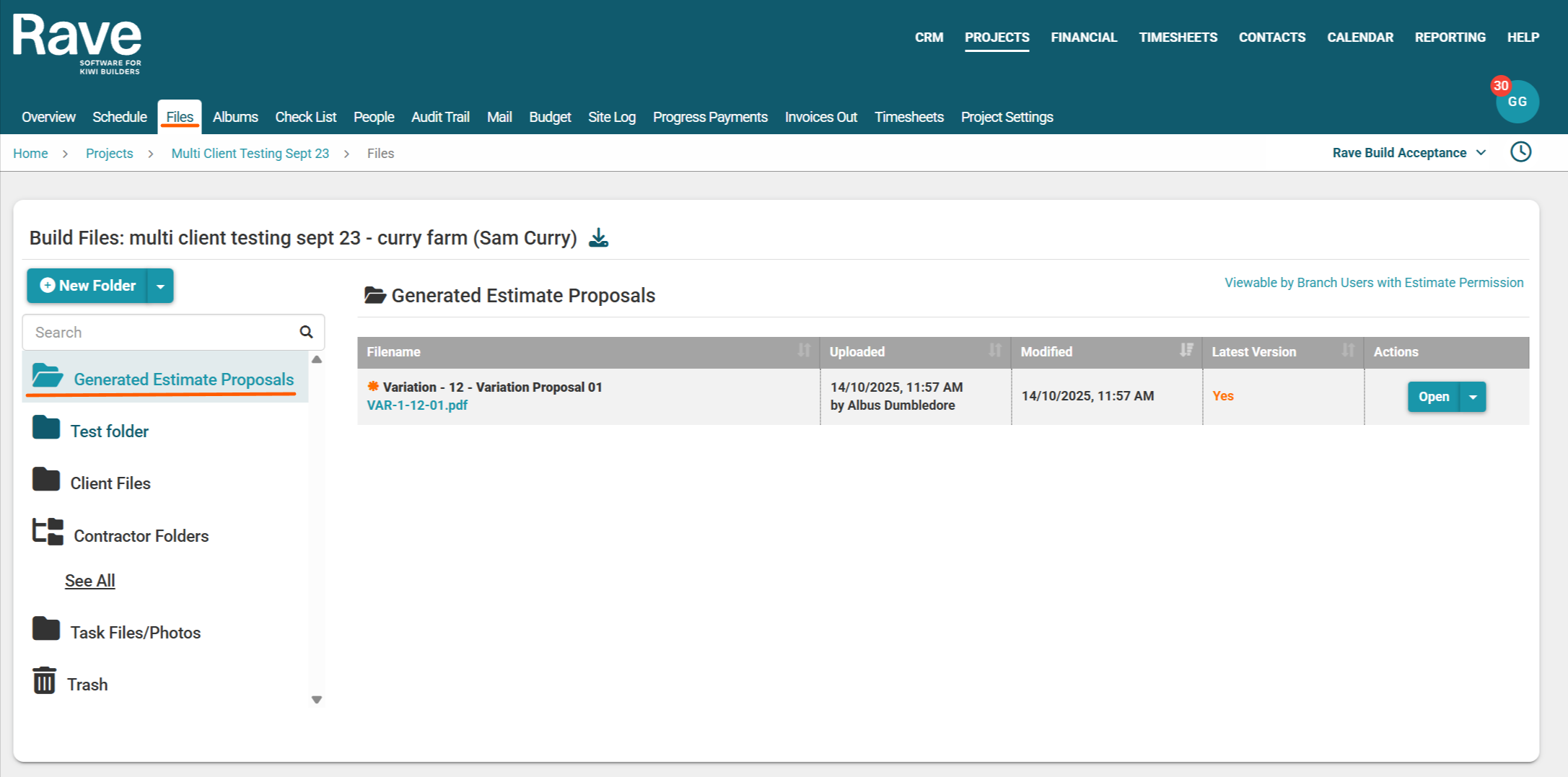Your Estimate Proposals file will stay stored there until you (or your team) replace it with a new one. Every time you send or generate a proposal, RAVE will save it for you and store it here, so you don’t have to worry that you might lose these files. We will also check the latest version box if you update that proposal and re-download or send it to the client with changes.