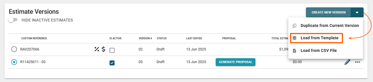 To load this new template into a fresh project, go to the budget sub-tab in that job and open the estimate page. This will currently be a blank page with no information loaded. Scroll down to the Estimate Versions section, and click on the CREATE NEW VERSION drop-down arrow, selecting the Load from Template option.