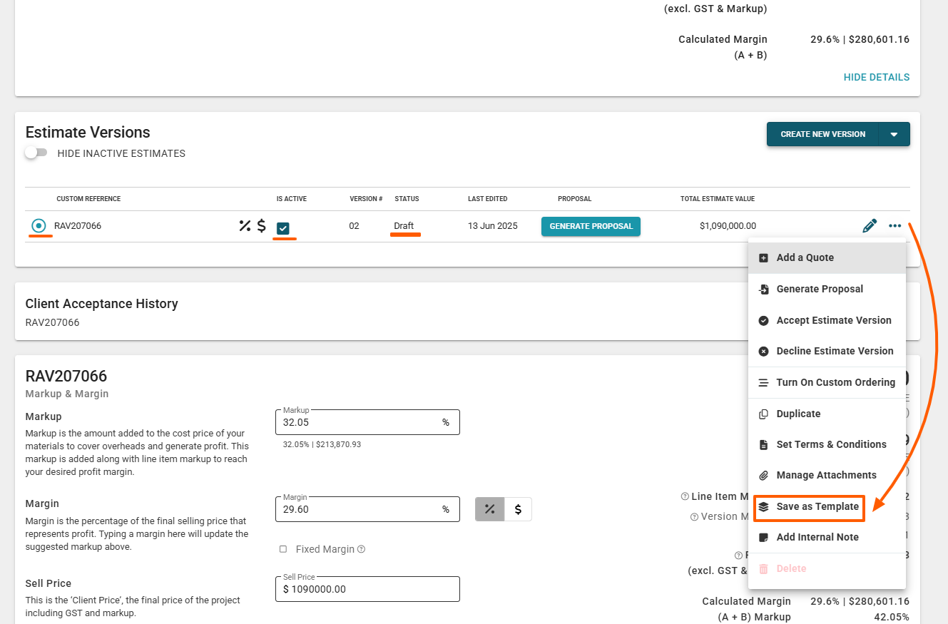 Note: Ensure that the estimate you want to save as a template is not accepted and still displays as a Draft status.