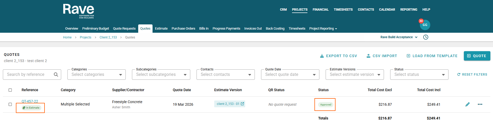 All quotes will be approved and loaded into the Estimate version and the Quotes page. The suppliers, chart of accounts, categories/subcategories and line item information are all copied from the template into this job. The pricing is not locked, as this estimate isn't approved yet. You can now proceed to make final changes/tweaks to the pricing, suppliers and other information before presenting to the client.