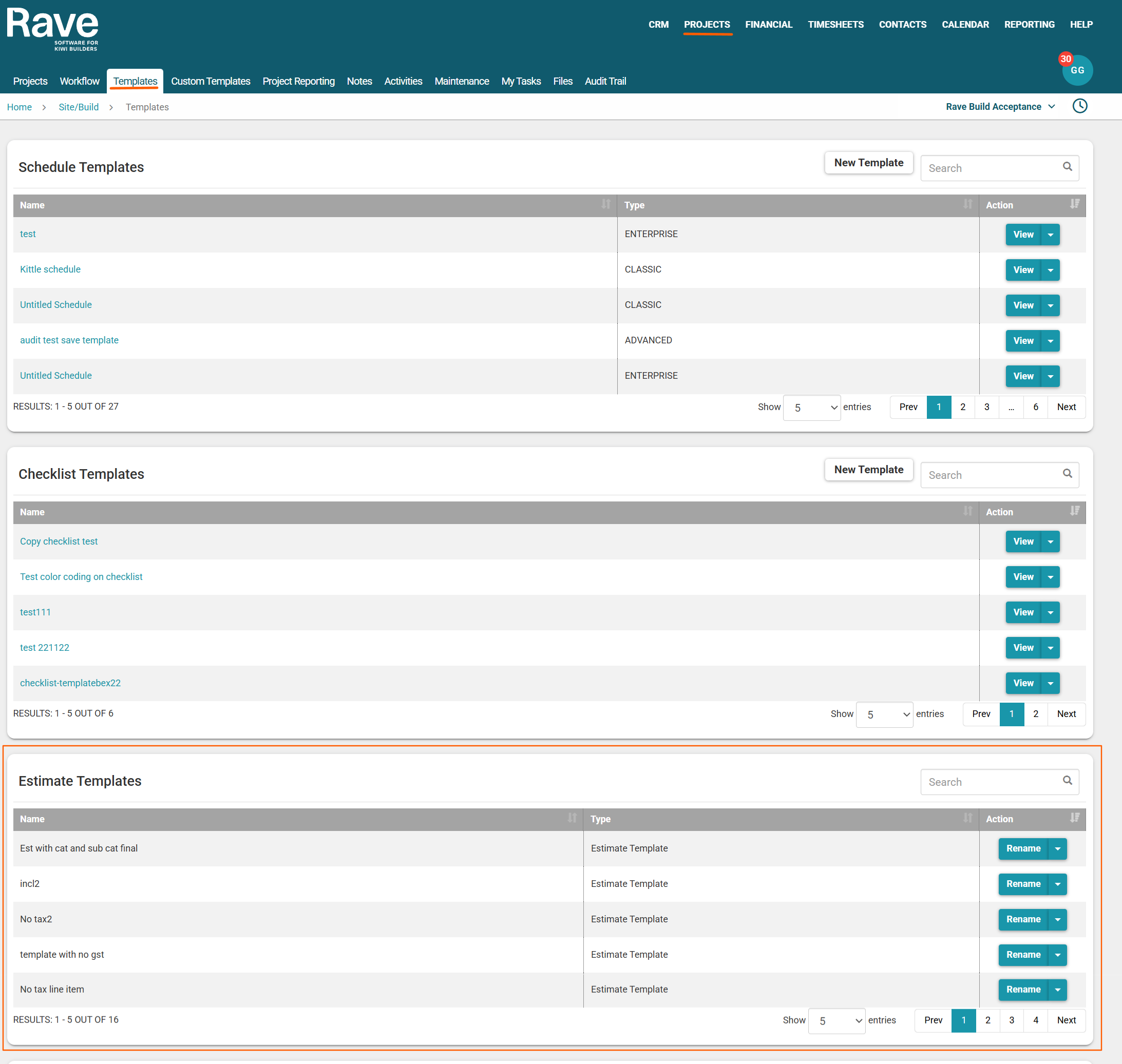 Your estimate templates are available from Project button then selecting, then scrolling down to Estimate Templates. You can rename a template or delete it in this menu to edit a template you must load it into a project make changes and re save as a new template.