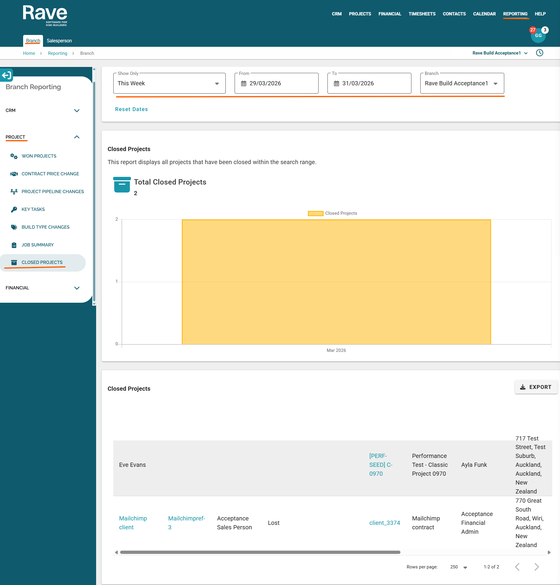 The top of the page has date-range filters and shows the number of projects closed in that range on a graph.
