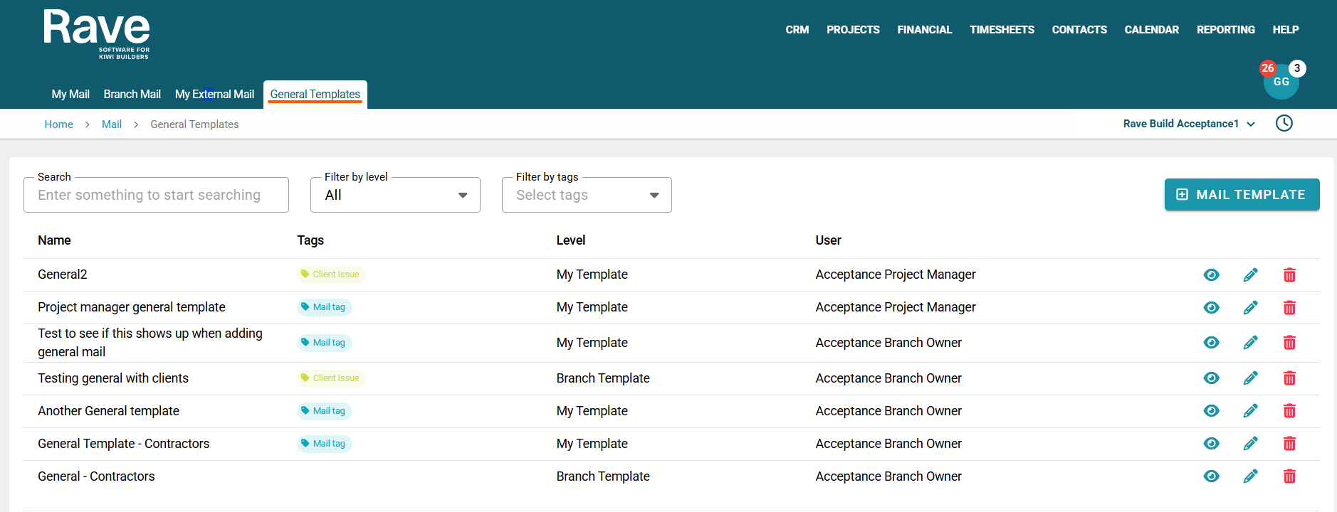 From the Mail tab, there is a General Templates section where you can create and manage your own General email templates, as well as branch-wide general email templates (if you have permission). These templates are only for creating General mail which is not linked to a specific enquiry or Project.