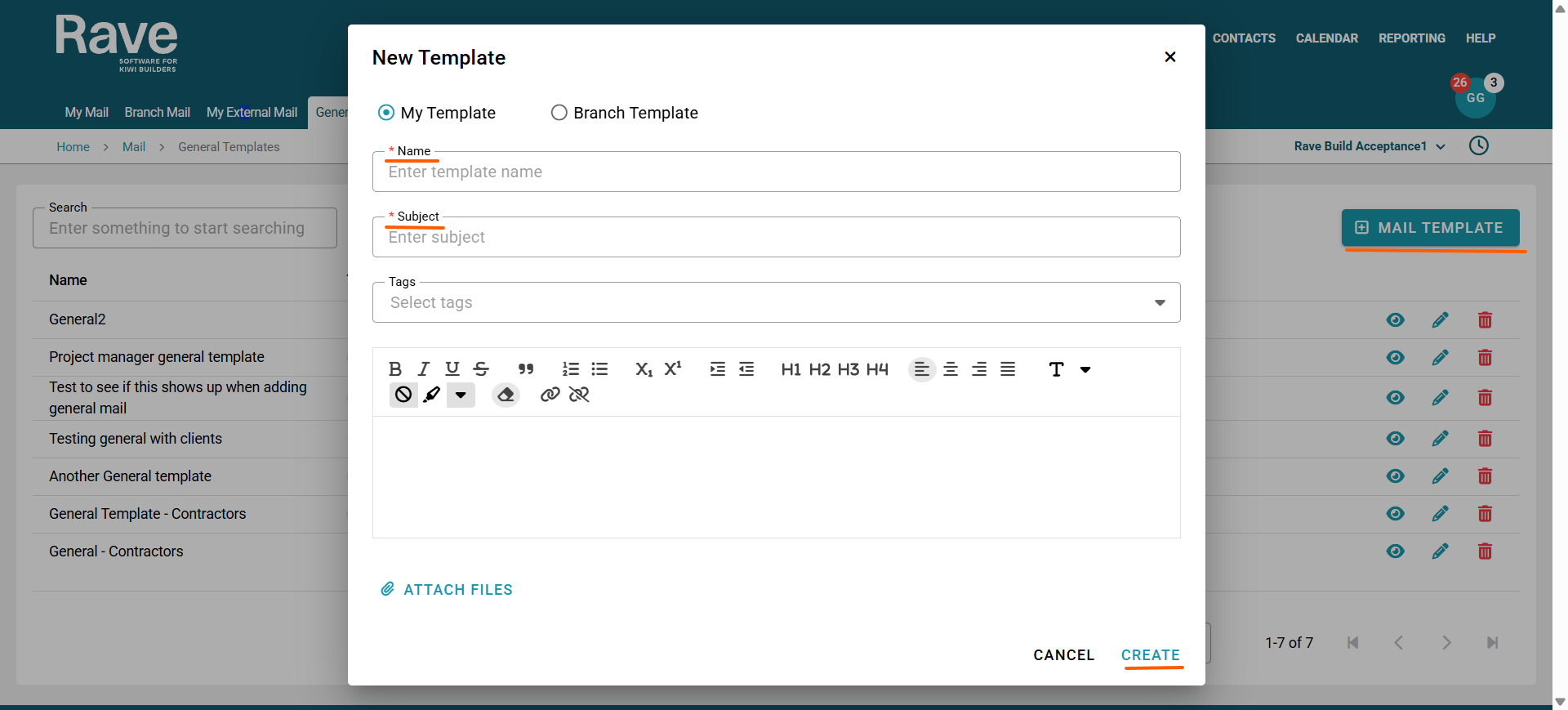 Click the + Mail Template button in the top right to open the create template option. With the appropriate permissions, you can create either branch-wide templates or your own personal templates.