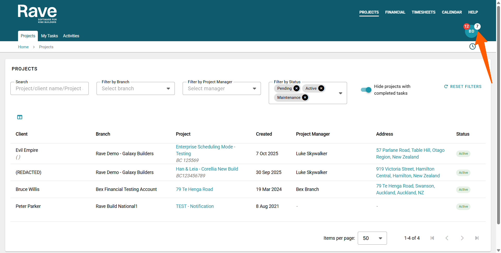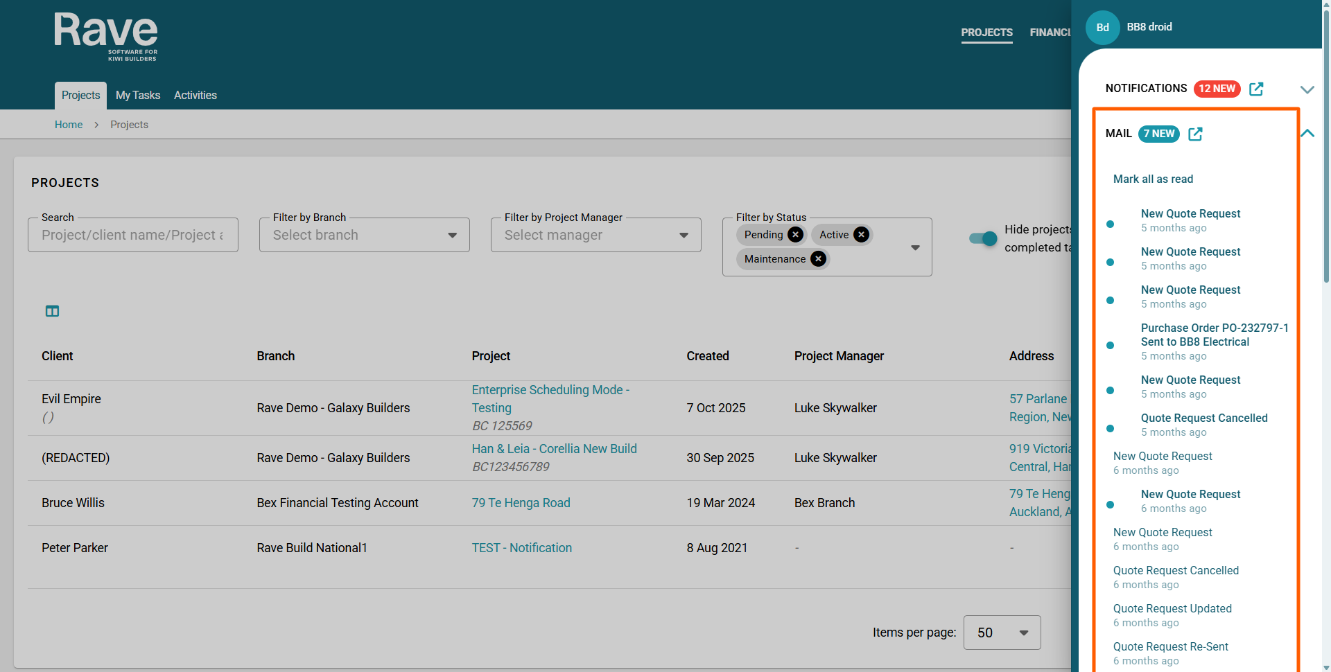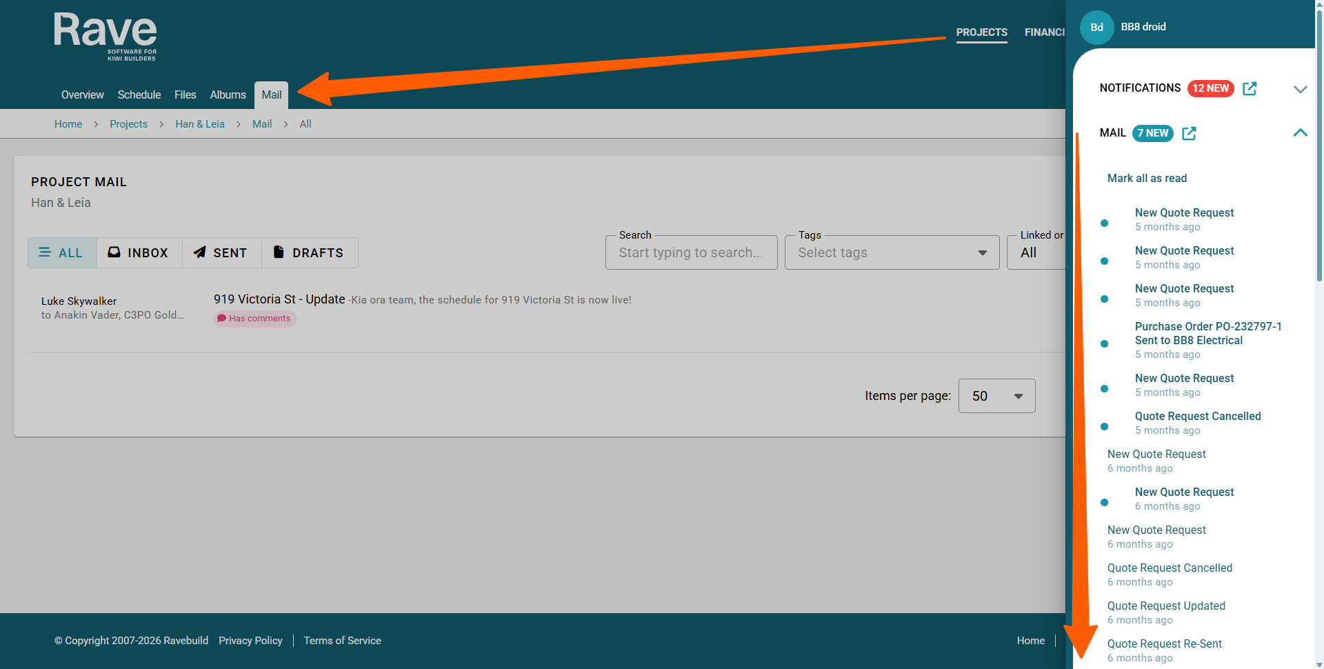 When you are sent any mail messages through RAVE, you will be alerted via your profile dropdown's white alert bubble, which displays the number of unread mail items. Clicking here lists your mail items, highlighting any un-read mail with a bullet point and in bold. Clicking on any mail heading takes you to that mail item, in that project. Alternatively, you can go to the project's Mail sub-tab to view all of your messages for that job.