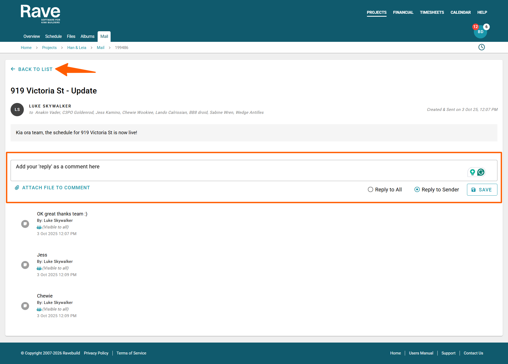 Once done, you can click the 'Back to List' button to go back to your Project Mail sub-tab.