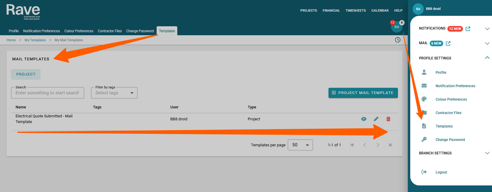 Any mail templates you've saved can be found via your profile dropdown, your initials in a circle to the top right of your screen, then going to Profile Settings/Templates. Here you can view, and manage all of your mail templates via the action icons to the right of each template, that is: