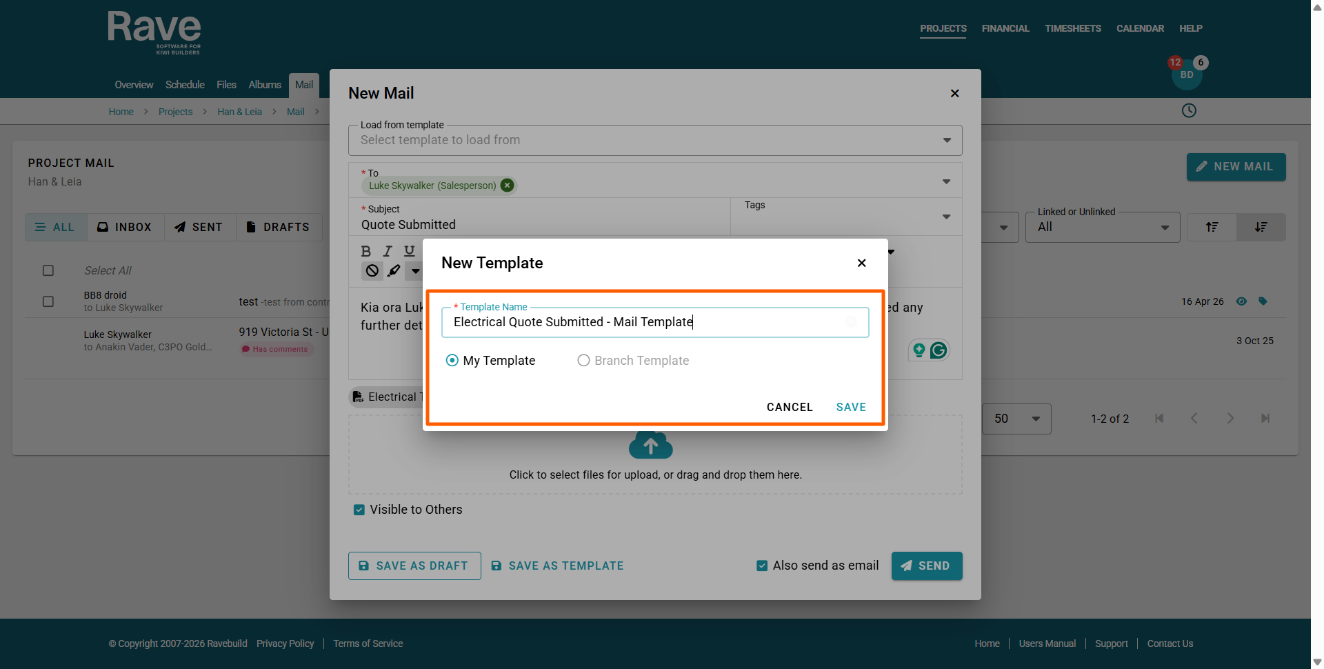 The New Mail pop-up lets you compose your mail, with the 'Load from template' drop-down at the top of the screen. You can then: