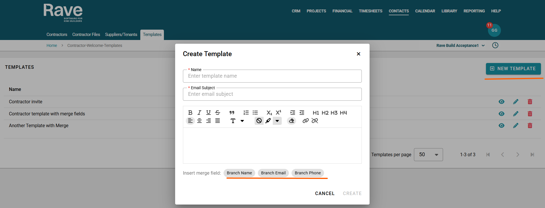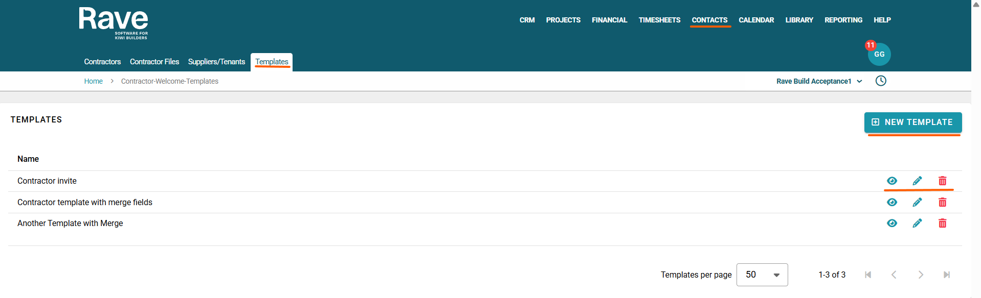 RAVE’s Contractor Welcome Templates stores your pre existing welcome message templates and allows you to view, edit, delete or create new ones with permission.