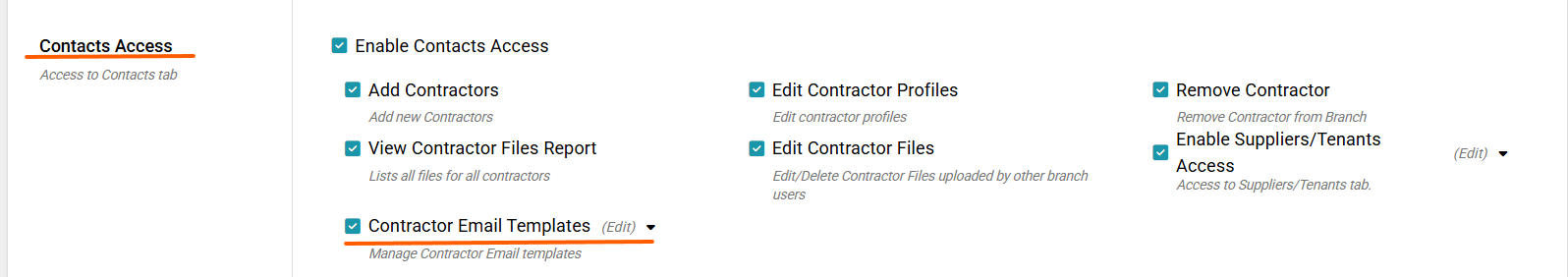 The permission is under Manage Users, Contact Access, Contractor email templates.
