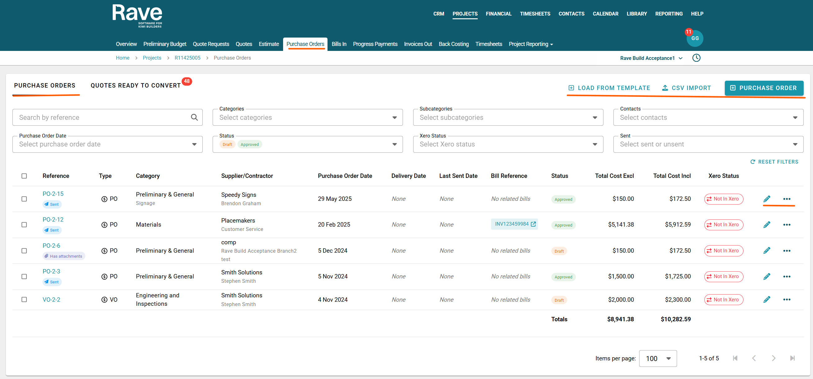 Filters along the top allow filtering by Category, Sub Category, Contacts, Purchase Order Date, Status and if connected to Xero, the Xero Status and Sent or Unsent Status.