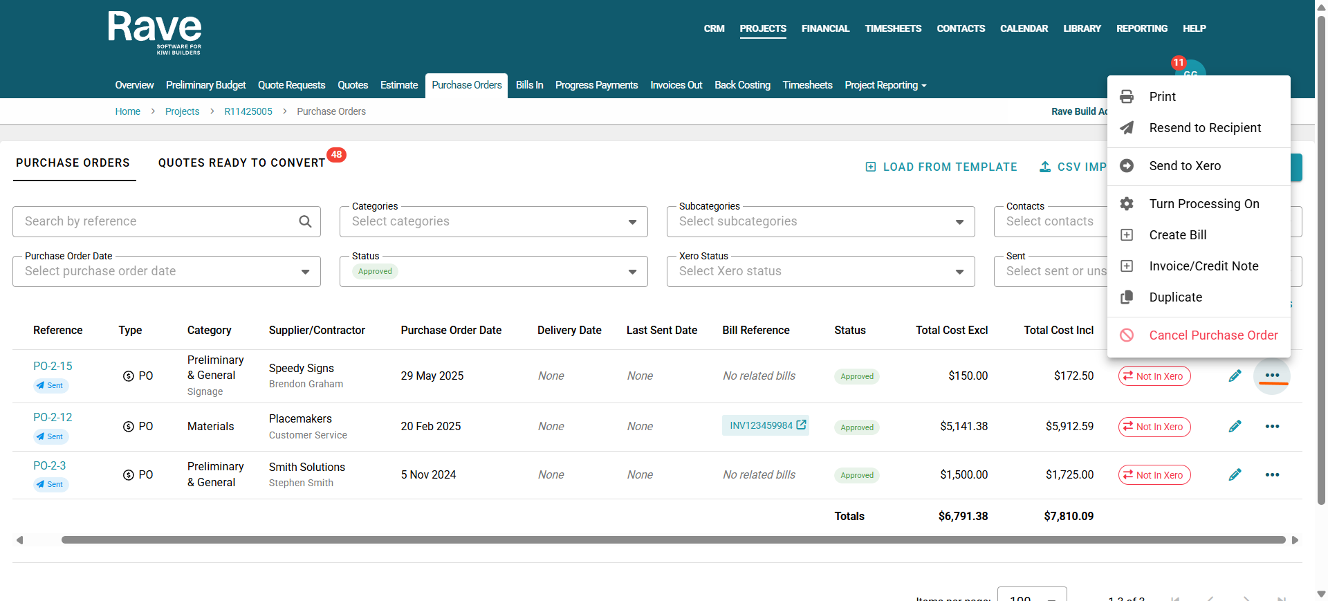 Update Account, Category, Subcategory, markup, send to Xero, create a bill, send/resend, create an invoice or credit note.